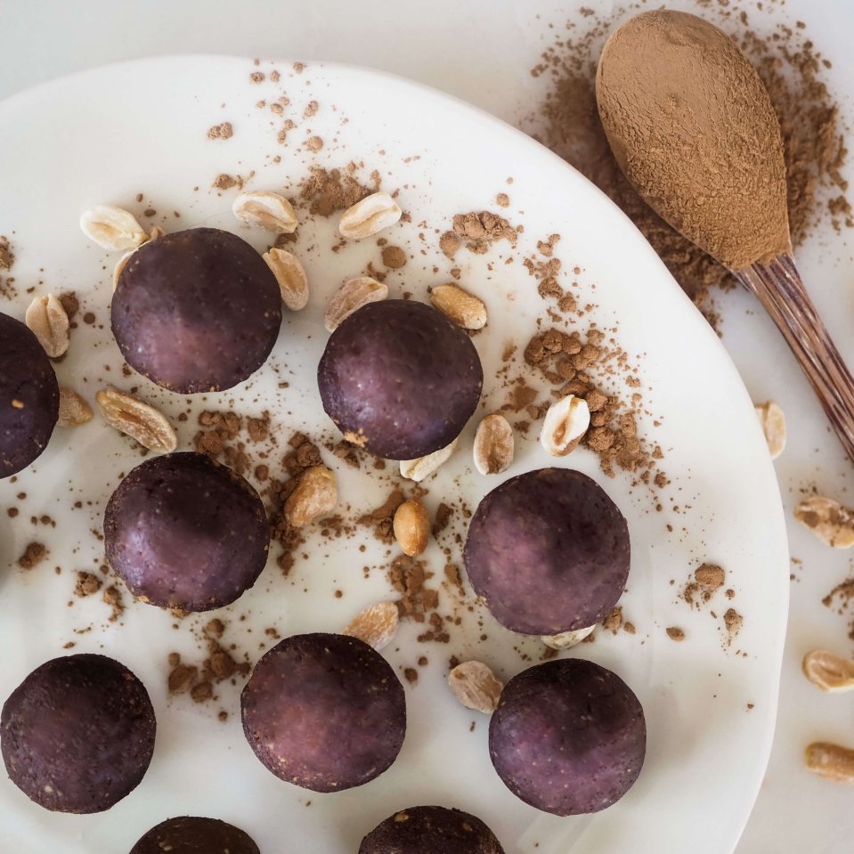 Arašídy dáme do mixéru a rozmixujeme je na jemnou mouku. Přidáme všechny zbývající ingredience a mixujeme, dokud nevznikne lepkavá směs. Směs přemístíme do mísy a vytvoříme kuličky, které dáme na hodinu do mrazáku. Poté můžeme rovnou podávat nebo skladujeme v lednici.