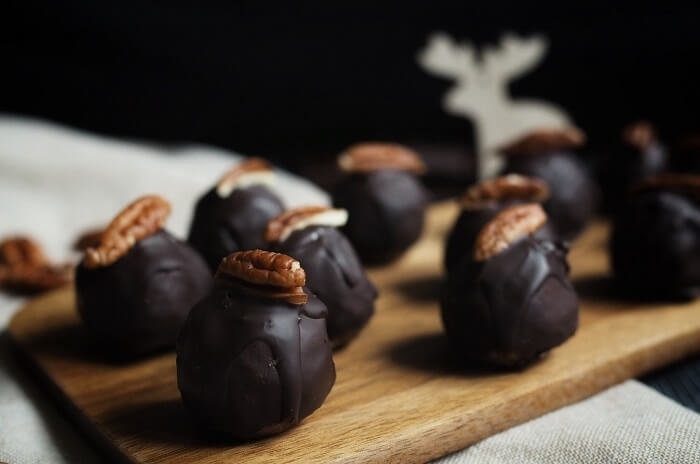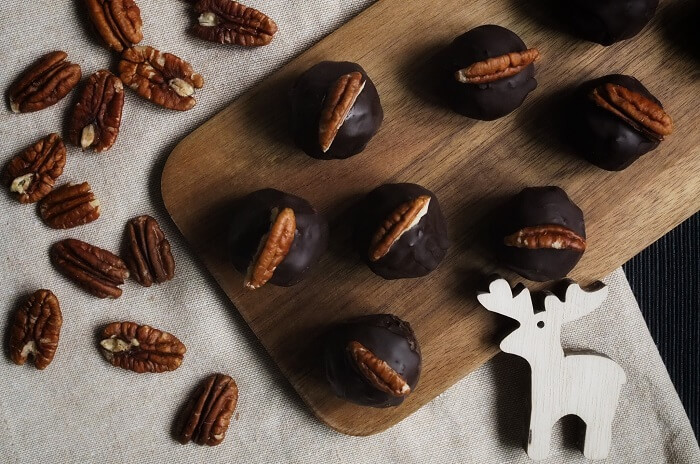 Datle si namočte přes noc nebo alespoň na pár hodin do vody. Pokud nestíháte, zalejte datle horkou vodou a nechte hodinu namáčet. Poté datle dejte do mixéru, přidejte pekanové ořechy, lžíci vody, ve které byly datle namočené, 3 lžíce rozpuštěného ghí a špetku soli. Vše promixujte do hladké hmoty. Tu pak dejte aspoň na 20 minut do lednice, aby ztuhla. Mezitím si připravte polevu - 100% čokoládu rozpusťte spolu se lžičkou kokosového oleje na mírném plameni. Z hmoty vytvarujte kuličky, které polévejte polevou a dejte na pečící papír. Ozdobte kouskem pekanu a dejte přes noc do lednice ztuhout.