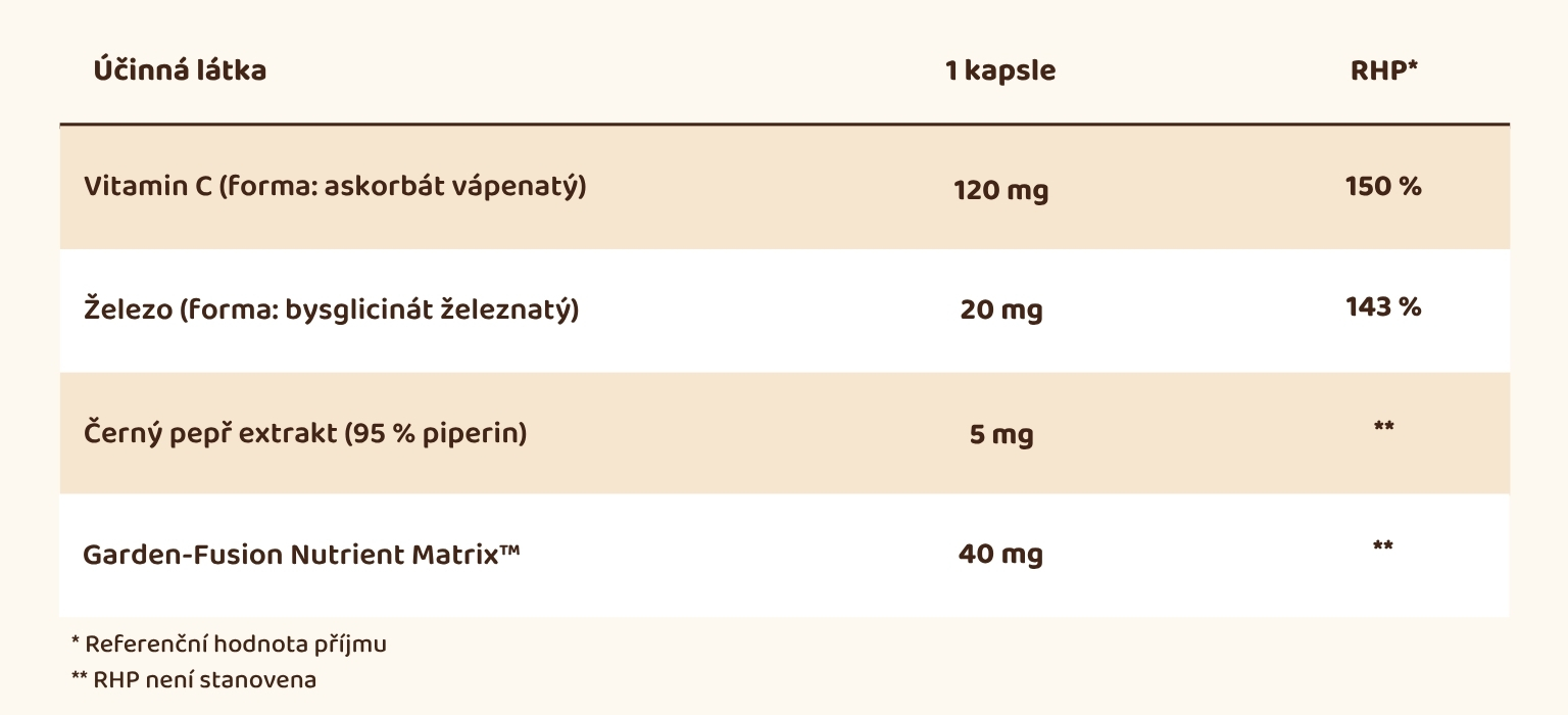 Alergeny jsou vyznačeny tučněVitamin C (askorbát vápenatý), HPMC kapsle, Garden-Fusion Nutrient Matrix™ [směs bio ovoce a bio zeleniny (jablko, červená řepa, brokolice, mrkev, špenát, rajče, zelená paprika, zázvor, česnek, cibule, petržel, květák, kapusta, zelené zelí, růžičková kapusta, okurka, chřest, dýně), himalájský shilajit pryskyřice, probiotikum Bacillus coagulans, prebiotická vláknina galaktomannan, komplex trávicích enzymů (alfa-amyláza, proteáza, laktáza, lipáza a celuláza)], bisglycinát železnatý, extrakt z černého pepře (Piper nigrum) s obsahem 95 % piperinu.