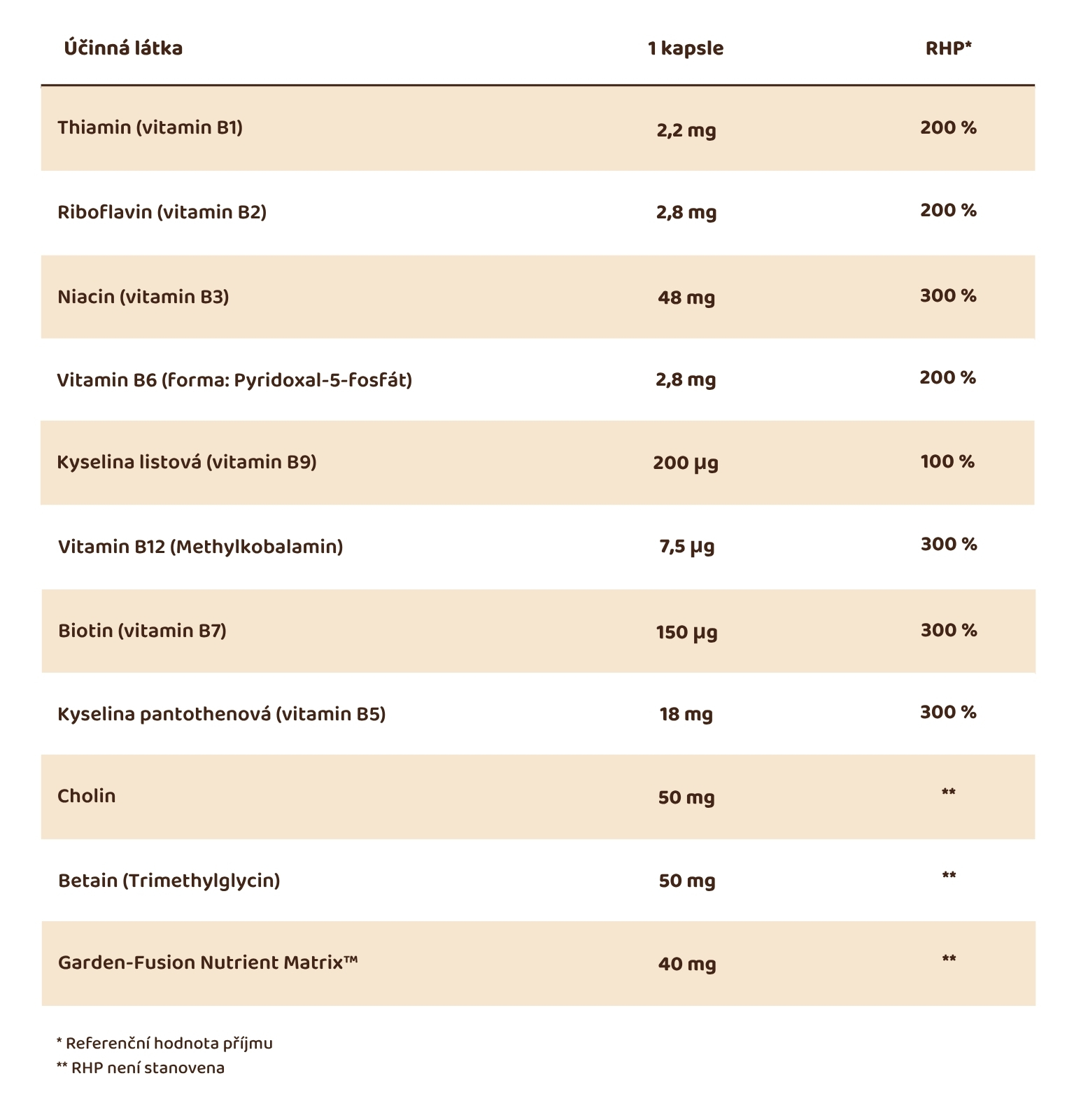 Garden Fusion Synergy B-Complex je prémiový doplněk obsahující všech osm esenciálních vitaminů skupiny B v bioaktivních formách, které tělo ihned využije bez nutnosti přeměny. Kombinace s patentovanou přírodní formou cholinu VitaCholine® a betainem podporuje funkci nervové soustavy, psychickou pohodu, energii i metabolismus. Vhodný při únavě, stresu, zvýšené mentální zátěži i pro celkovou vitalitu. Více informací